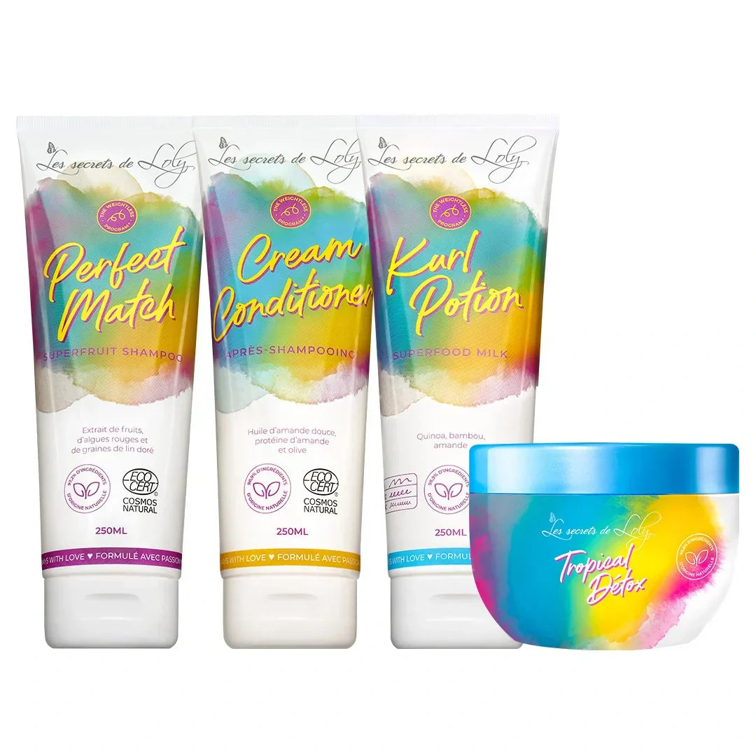 Appliquez dans un premier temps par section le Perfect Match sur cheveux mouillés en insistant sur le cuir chevelu. Après avoir rincé et essoré vos cheveux, appliquez le Cream Conditioner et laissez-le poser 2 minutes, puis démêlez sur la longueur et rincez. Après avoir essoré vos cheveux dans une serviette microfibre en scrunchant, appliquez le Kurl Potion par section. Enfin scrunchez encore et encore puis laissez sécher à l'air libre ou avec un diffuseur à air tiède. Le Tropical Detox quant à lui peut s'utiliser de 4 manières différentes >>